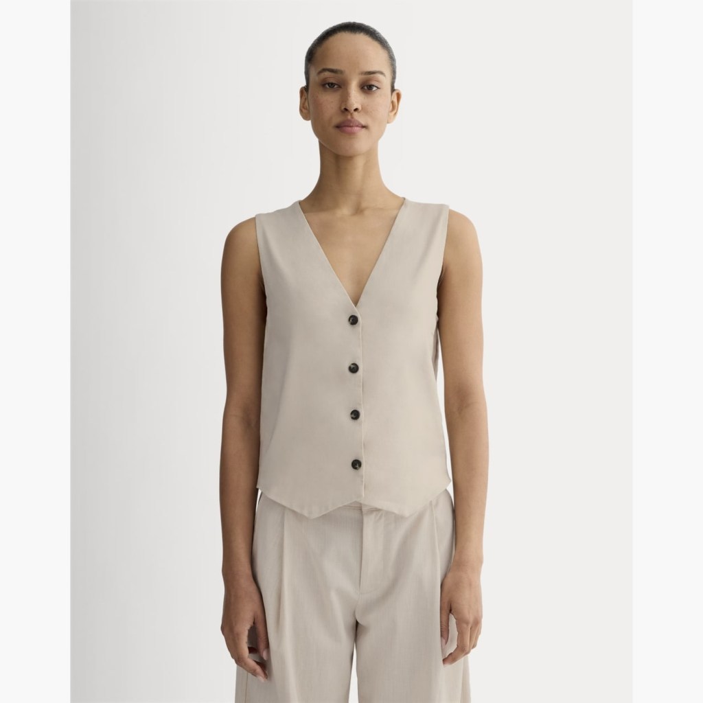 The easiest version is an ecru or beige waistcoat with washed blue jeans. The color contrast is gentle, the denim adds familiarity, and the waistcoat gives the outfit a cleaner shape than a tank alone would. If you want something dressier, pair it with loose trousers in the same color family but break the suit effect with flat sandals or a woven bag.